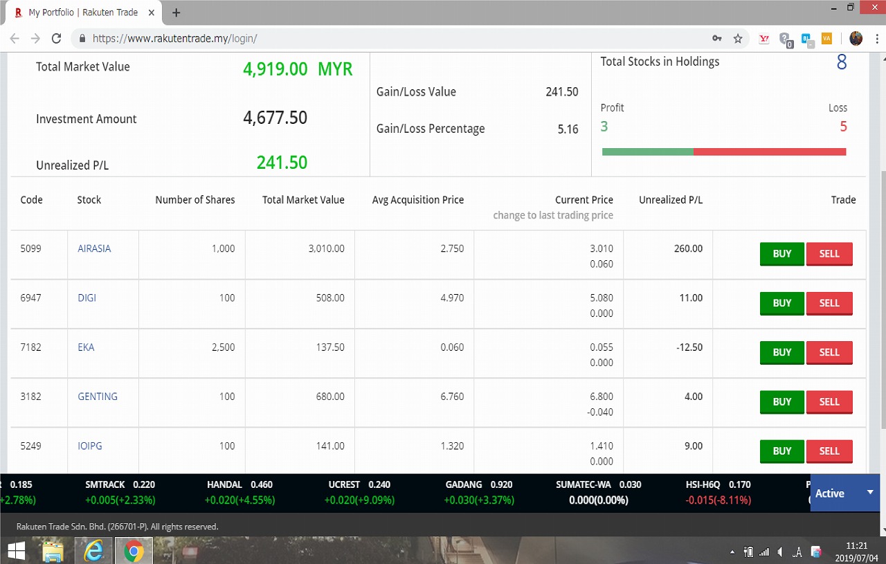 さて、先週から放置していたRakuten TradeですがRM182.81の利益が発生していました。少額ながら大変嬉しいです。外国証券口座を開設するのは初めてのことだったので、開設出来ただけでも感動でした。ですから利益RM1でも十分嬉しく思います。