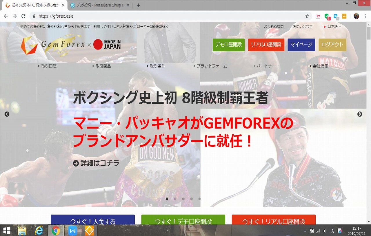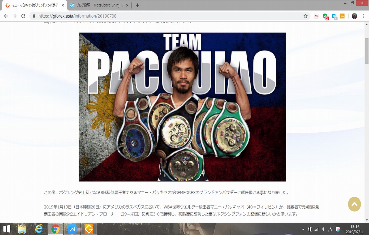 私がいつもお世話になっているGEMFOREXが、ボクシング王者マニー・パッキャオの正式スポンサーになったようです。
