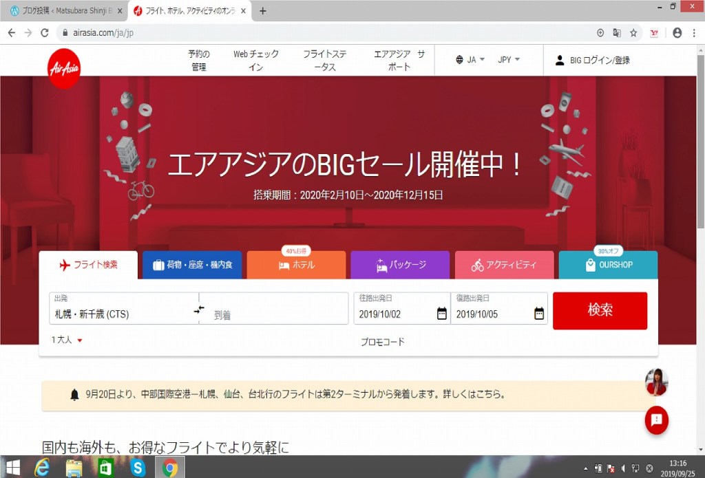 9月23日から9月27日までエアアジアのBIGセールが開催されています。BIGセールとは年4回行われる格安航空券の限定販売です。