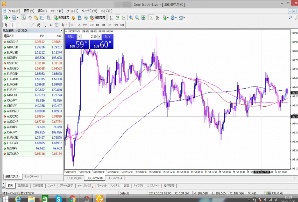 ドル円108.55ロングエントリー。SL108.45。TP108.70です。