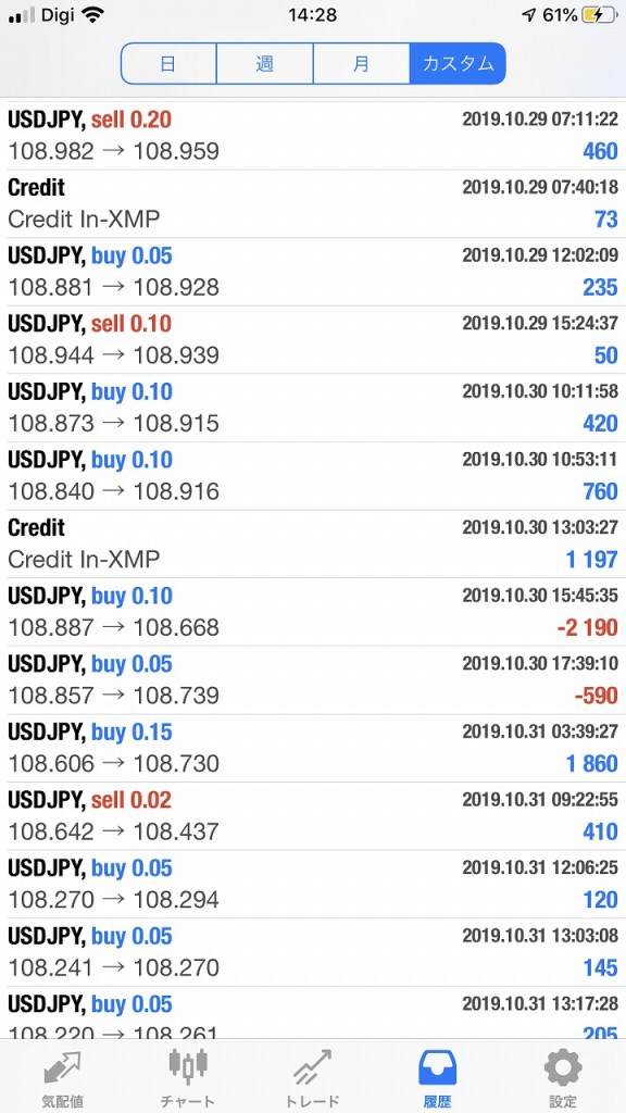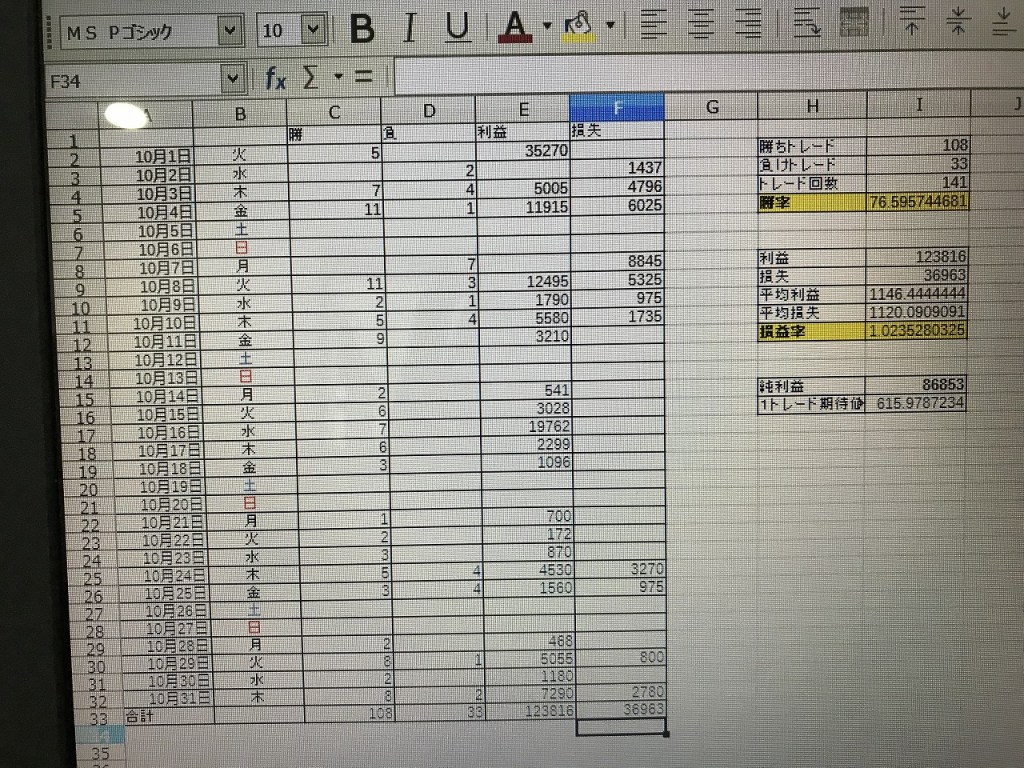 10月のドル円トレード新手法は勝率76.5の損益率1.023。トレード回数はトータルで141回。利益は86853円と表面上は安いがこれで良い。ロットを増やすことで解決する。