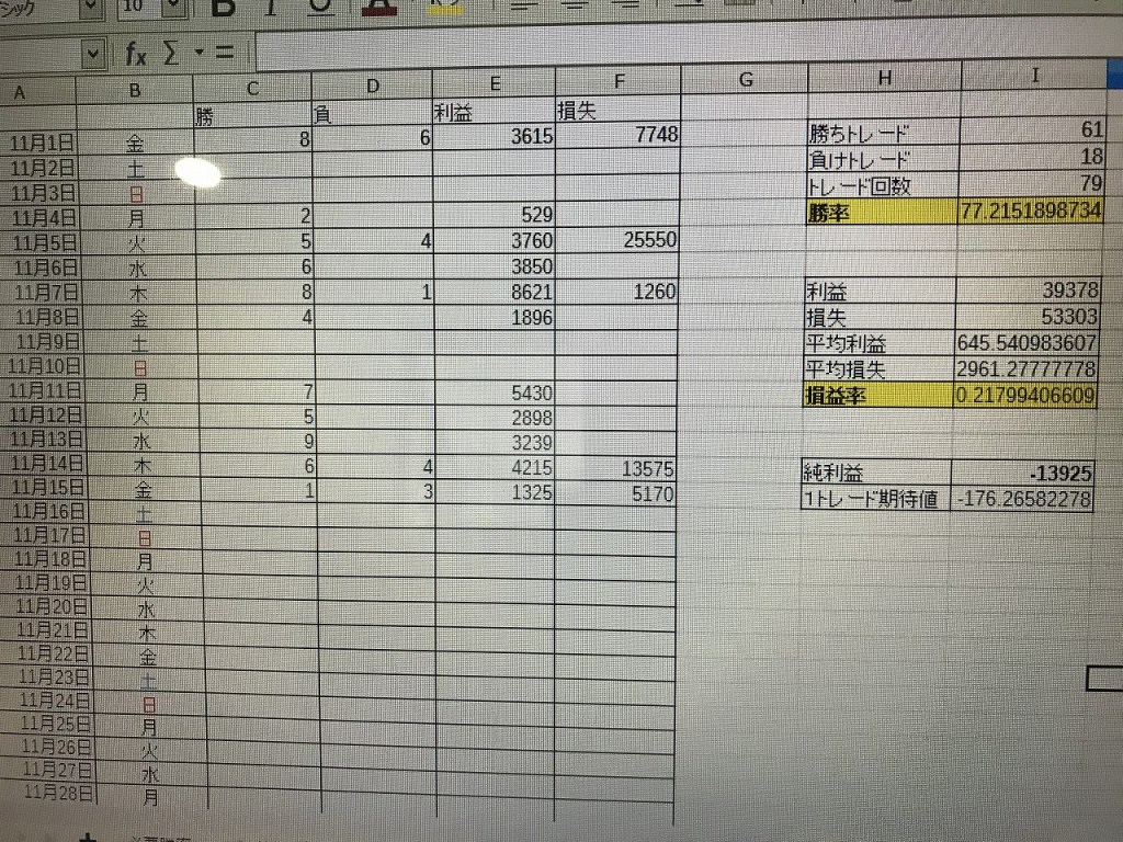今月のトレード回数79回、先月141回。合わせると昨日まで220回トレードしたことになり、手法の結果が出るまで残り600回。つまりは規定回数まで後二ヶ月はかかりそうなので何か良い策がないかと現在研究中でございます。