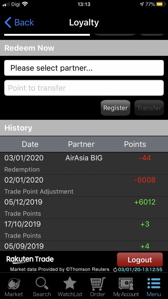 昨日まで存在していたRakuten Tradeの6000ポイントが本日突然消失してしまいました。いつもはポイントが付くとBig Loyaltyに送っていたのですが、今回は放置してしまったことが原因かもしれません。ポイントが付いたのが12月5日でしたので約一か月で消失ということになりますね。
