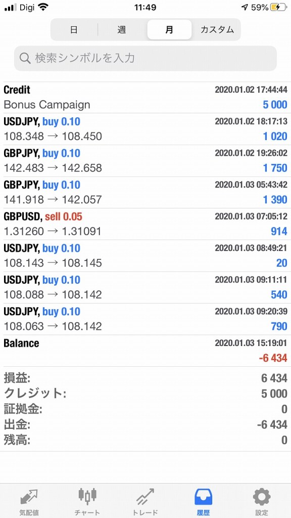 とりあえず今回は調査なので、入金はせずに5000円分のボーナスのみでトレード開始。コツコツトレードして6434円の利益が出たので早速出金申請を出してみましたが、わずか30分ほどで出金が完了しbitwallet内で着金の確認が取れました。
