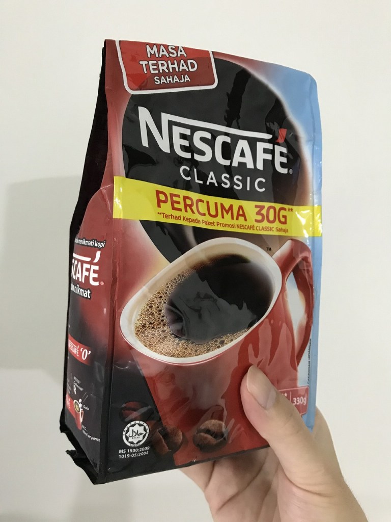先月までは自宅で淹れるドリップコーヒーが私の相棒でしたが、ついに日本から持ってきたドリップコーヒーが無くなりました。 Macコーヒーも途中コラボしてましたが、Macまで行くのが面倒になり最近は自宅でコーヒーを飲むことが多いということでNescafeインスタントが新しい相棒となりました。値段はRM27(715円)のところキャンペーンでRM14(371円)で購入。まぁまぁの値段ですね。