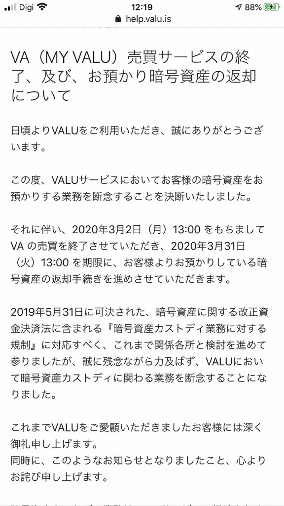 2020年3月2日付けでVALUはトークンの売買を終了すると発表しました。