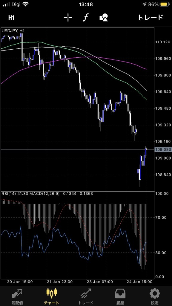 ドル円108.80でロングエントリー。SL108.60。TP109.20。