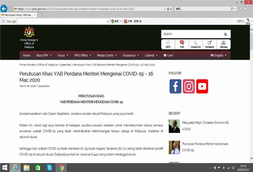 参考記事:首相官邸)https://www.pmo.gov.my/2020/03/perutusan-khas-yab-perdana-menteri-mengenai-covid-19-16-mac-2020/