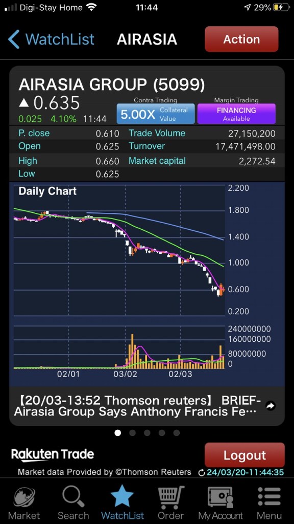 もう買わないと決めていたエアアジア株ですが、チャート見てたら買いたくなってきました。現在価格は0.600なので、1.000くらいまでは戻りそうな予感。つまりは上がってくれれば投下資金が倍。経験則でいうと、このパターンのチャートの勝率は約70%