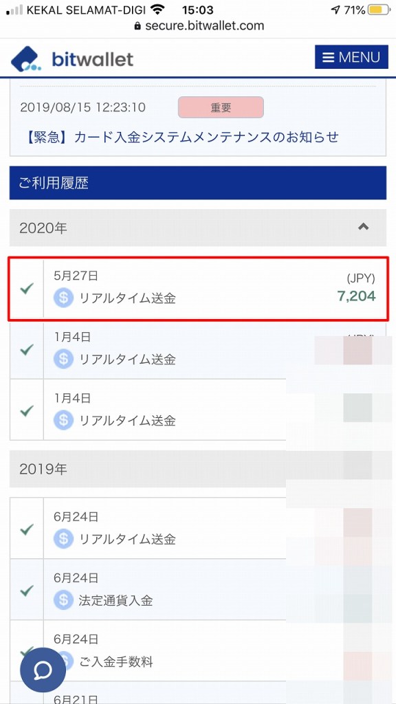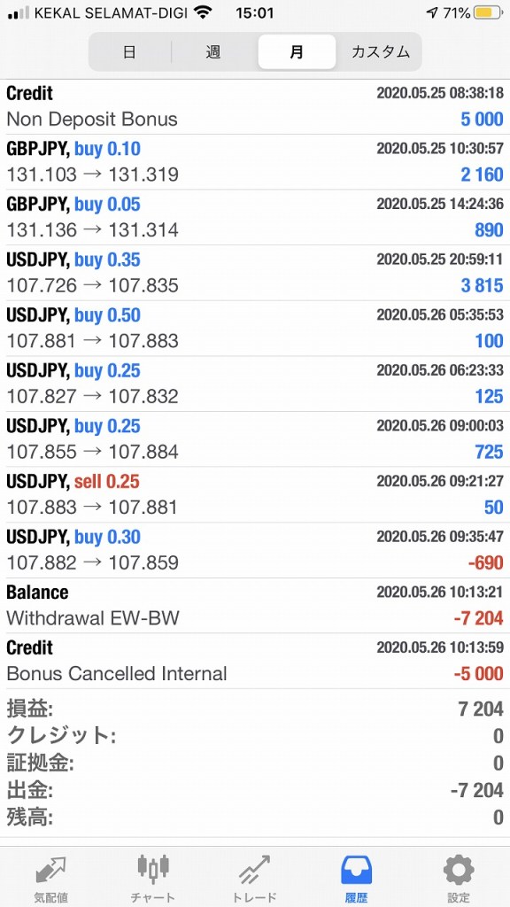 とりあえず7000円くらい利益出せたので出金してみました。ボーナスのみでトレードしても差益はきちんと出金してくれるみたいです。本日bitwalletに着金。ありがとうございました。入金ボーナスは最大5000米ドルまで随時付与されるらしいので機会があれば10000米ドル入金してフルスイングもありかなと。