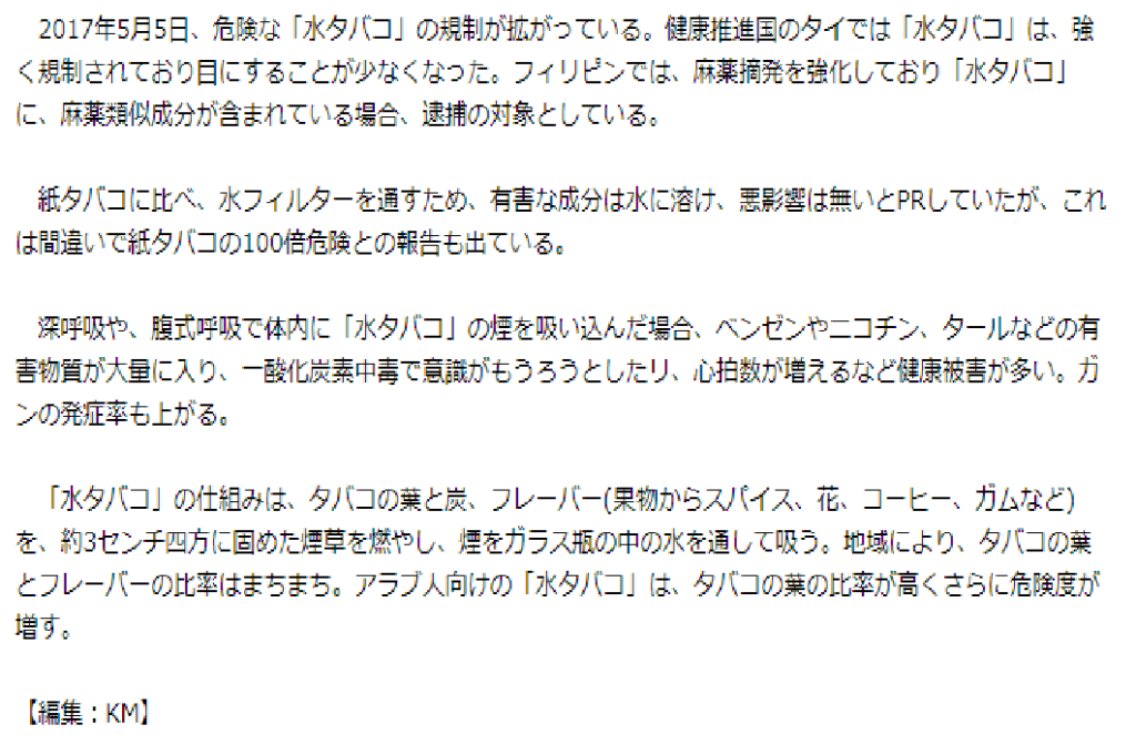 ・健康推進国のタイでは「水タバコ」は、強く規制されており、目にすることが少なくなった。フィリピンでは、麻薬摘発を強化しており「水タバコ」に、麻薬類似成分が含まれている場合、逮捕の対象としている。