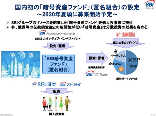 SBIホールディングスが日本初の「暗号資産ファンド」を立ち上げることを明らかにしました。出資者が事業者に対して出資を行い、事業者が出した利益を出資者に対して分配する契約である匿名組合の形式で、個人投資家向けに2020年夏頃から募集開始を予定。