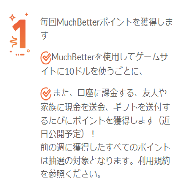 つまり、MuchBetterを使い10ドルをオンラインカジノ等に課金することで、ポイントが獲得できるというわけです。