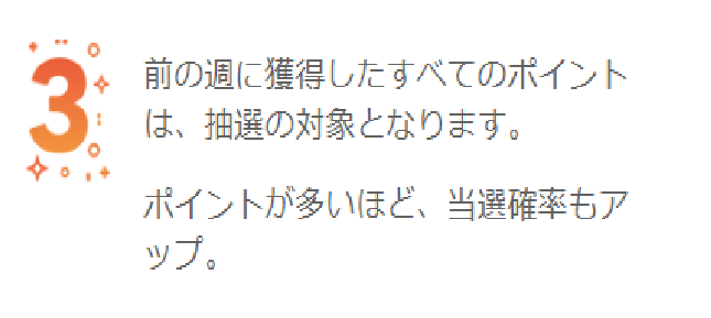そして、獲得したポイントが多ければ多いほど、毎週月曜開催の「現金プレゼント抽選」の当選確率がアップするとのこと。