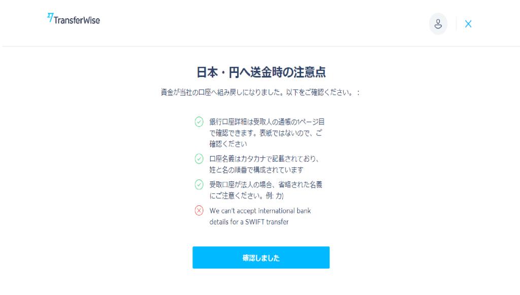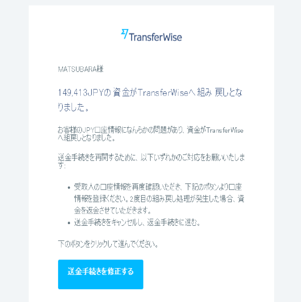 口座情報にミスがあると、TransferWiseへ組み戻されることもあるので注意。