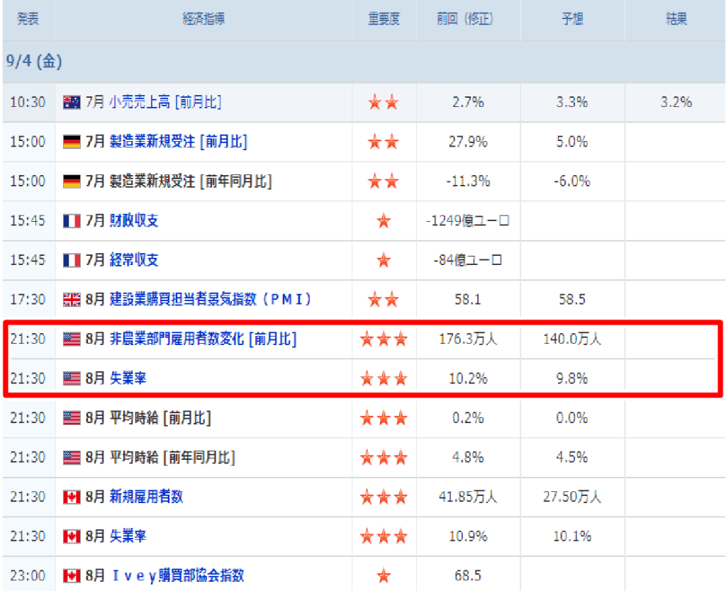 本日2020年9月4日(第一週金曜)の経済指標カレンダーです。