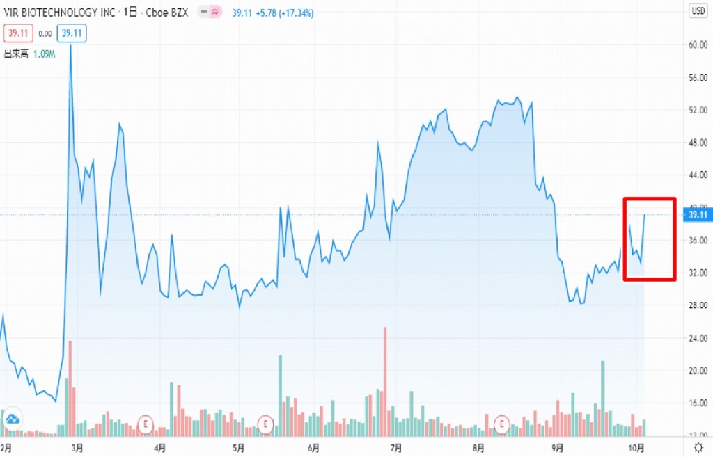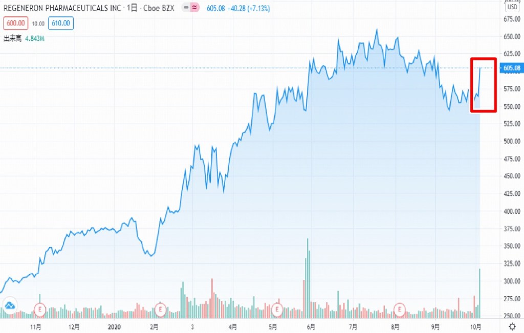 トランプ大統領が退院したことで「リジェネロン(REGN)」「バイオンテック(BTNX)」「ヴィルバイオテクノロジー(VIR)」の株価は上昇しました。