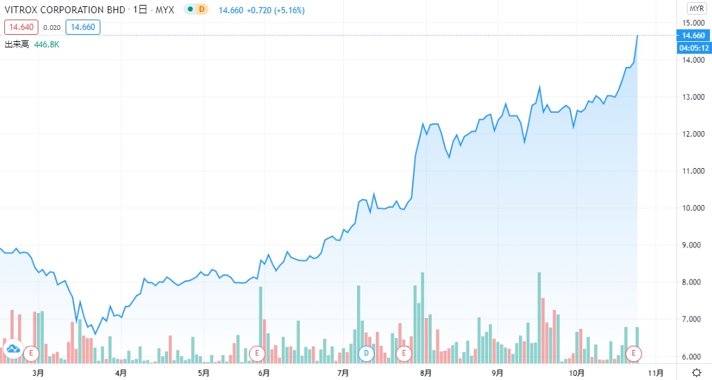 ViTroxの株価は、5.31%(74セン)上昇し、史上最高値のRM14.68まで上昇しました。午前11時15分、取引量は78,500株と少ないものの、カウンターは42セン(3.01%)上昇してRM14.36で取引されました。
