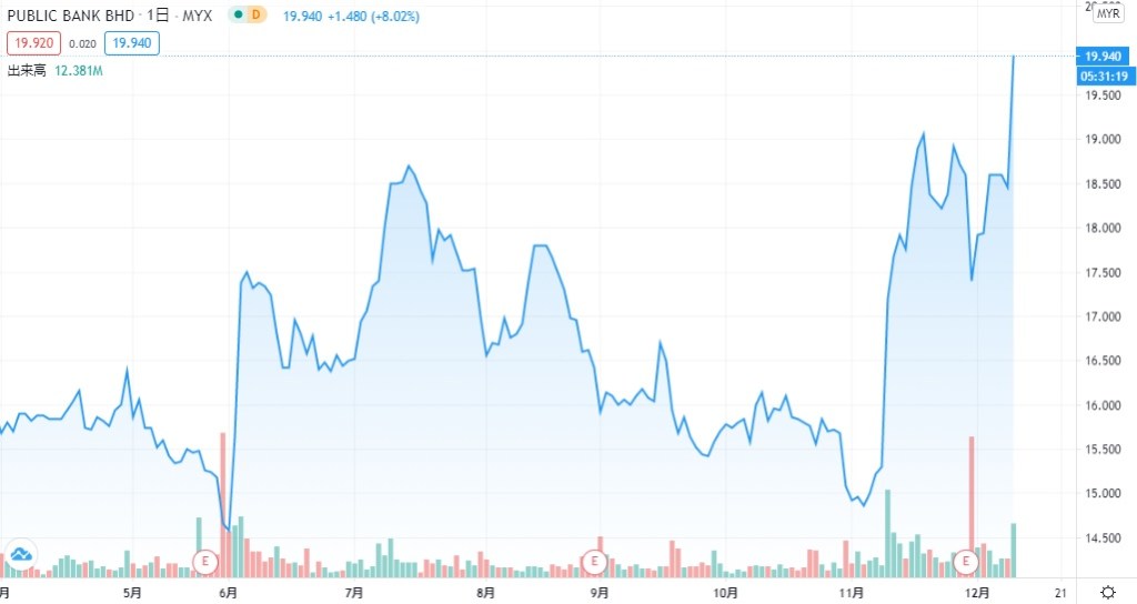 今日の午前9時2分、パブリックバンクはRM1.24または6.72%上昇してRM19.70になりました。