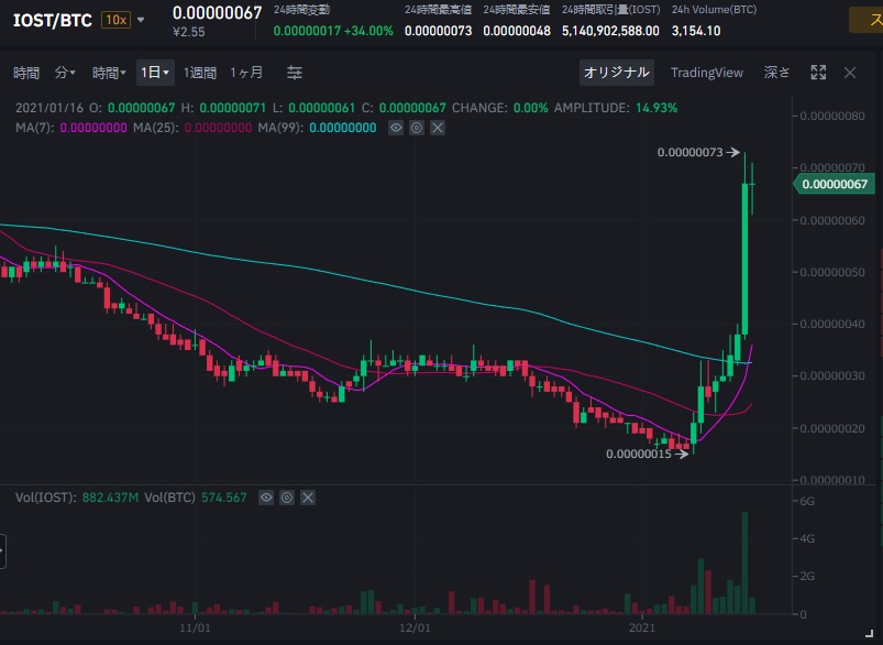 バイナンスのIOST/BTCチャートですが、現時点で前日比+34%と凄まじいです。